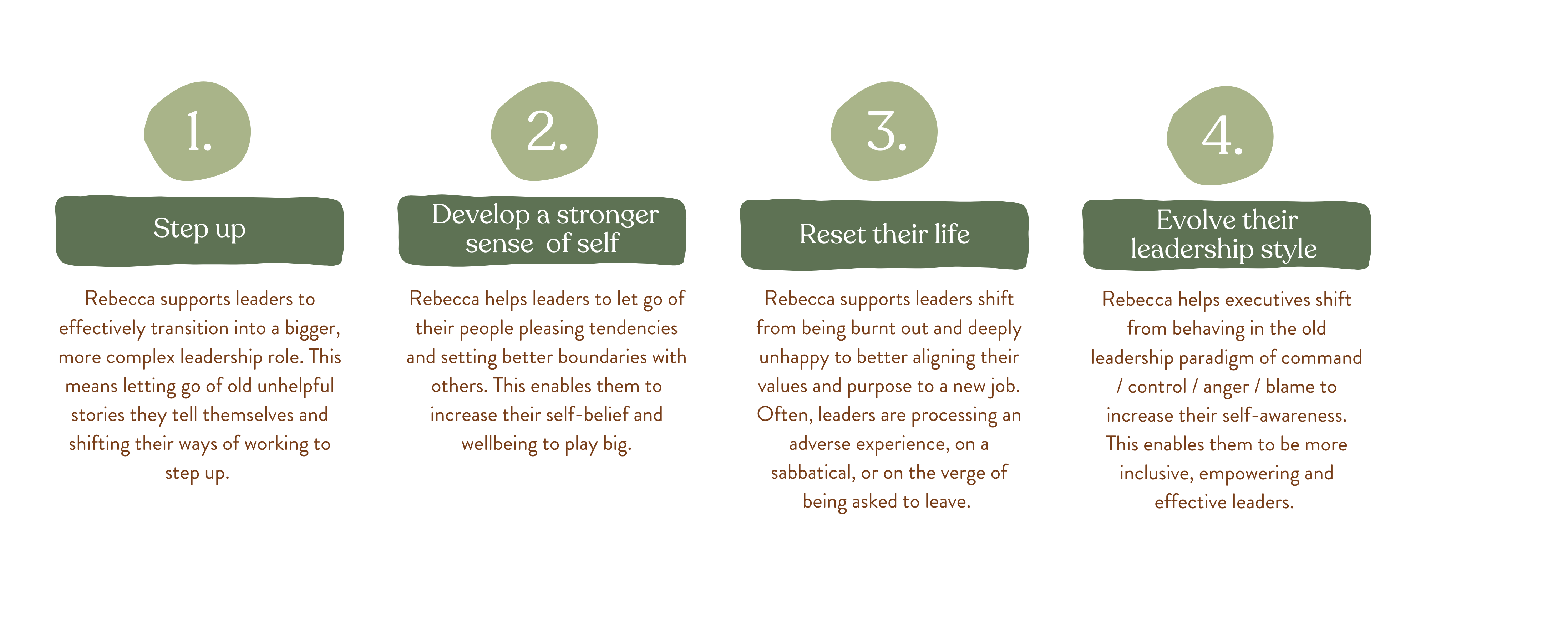 Rebecca generally coaches leaders in 4 different areas supporting leaders.