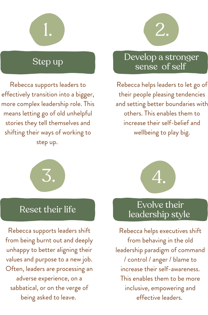 The feedback Rebecca receives from executives and senior leaders is that her coaching style helps them increase their self awareness to understand their cognitive, emotional and behavioural patterns, which enables positive behavioural change where they increase their influence, effectiveness, focus and wellbeing by playing big/stepping into their greatness. They have more confidence, presence, ability to challenge and agility in the way they relate to others which increases their impact. So many senior leaders underestimate the contribution they can make and get locked in unhelpful patterns of interacting with their peers, boss, the board, or stakeholders. Rebecca helps them understand their triggers/what presses their buttons and reframe the way they see themselves and others.